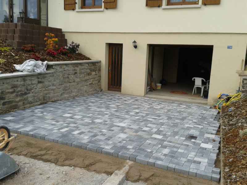 Extension de terrasse. Préparation du sol, pose de dallage sur lit de sable compacté.