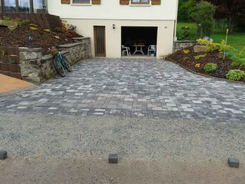 Création d'une entrée de garage en pavés sur chape maigre. Finition bord de route en béton gravillonné.