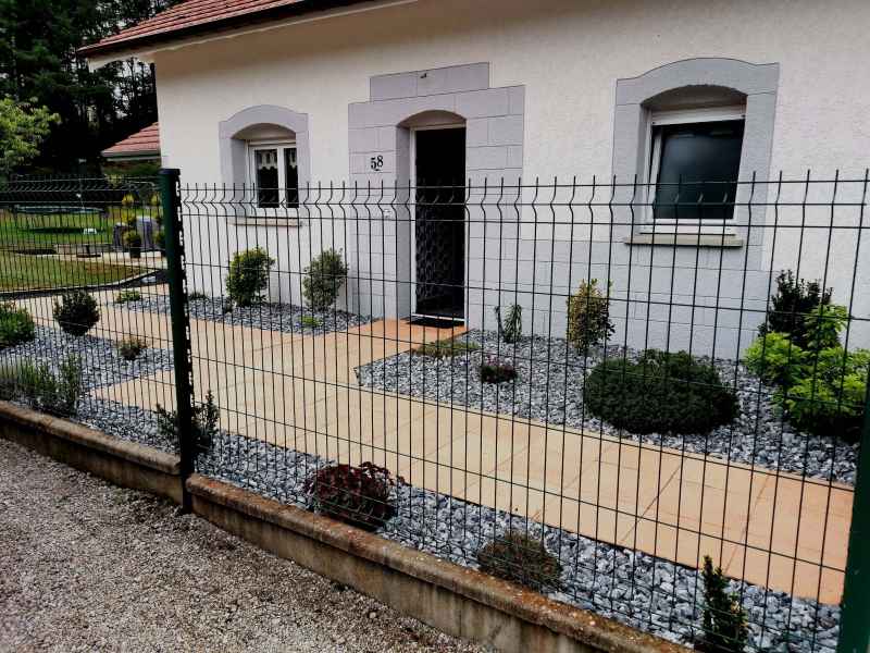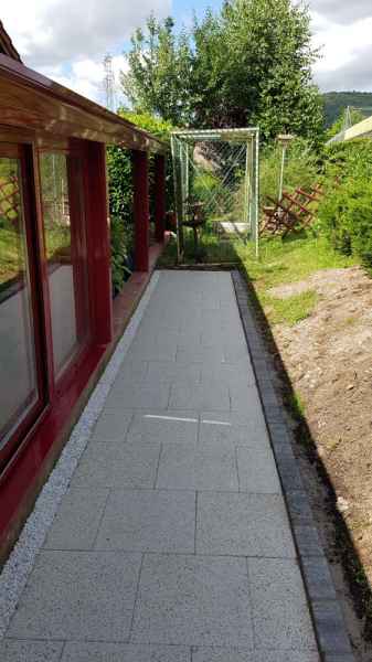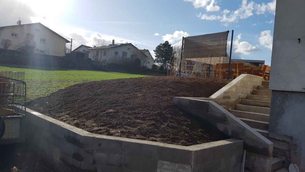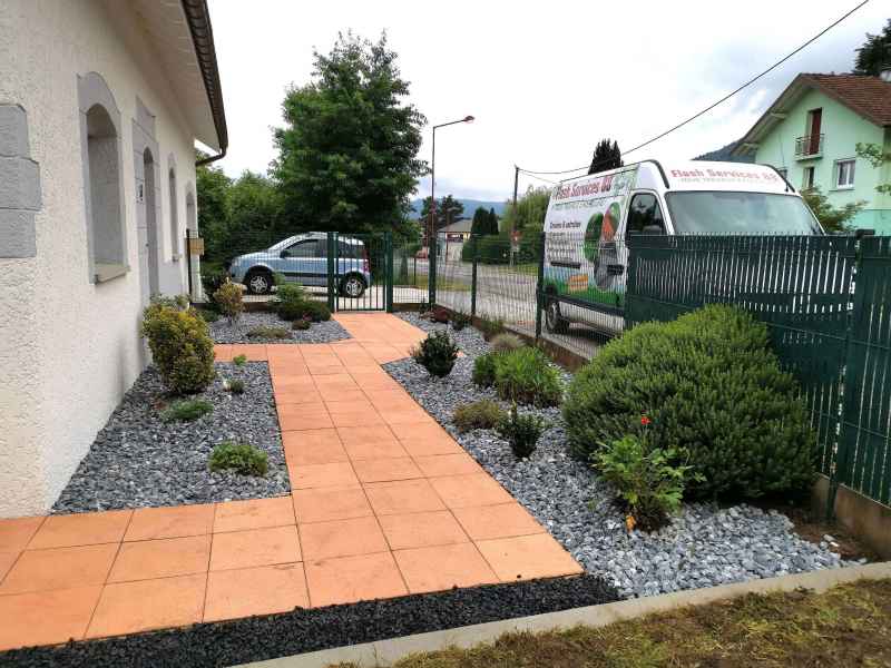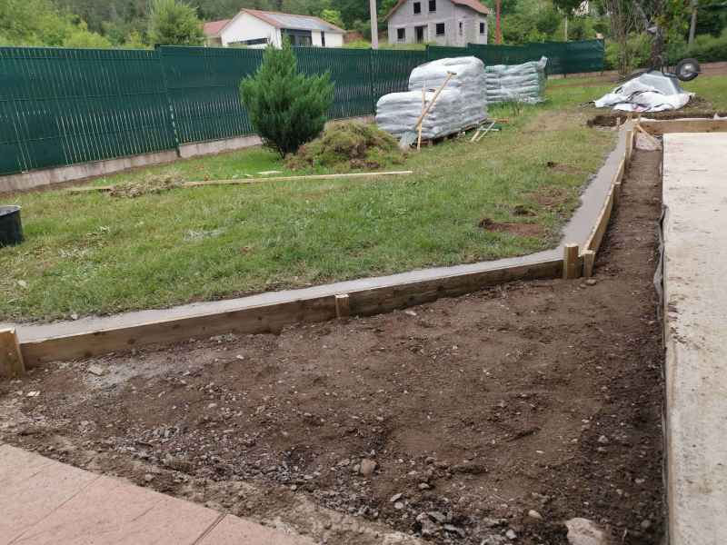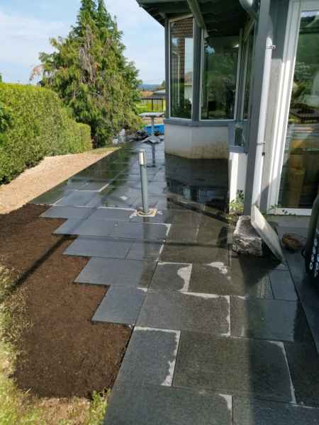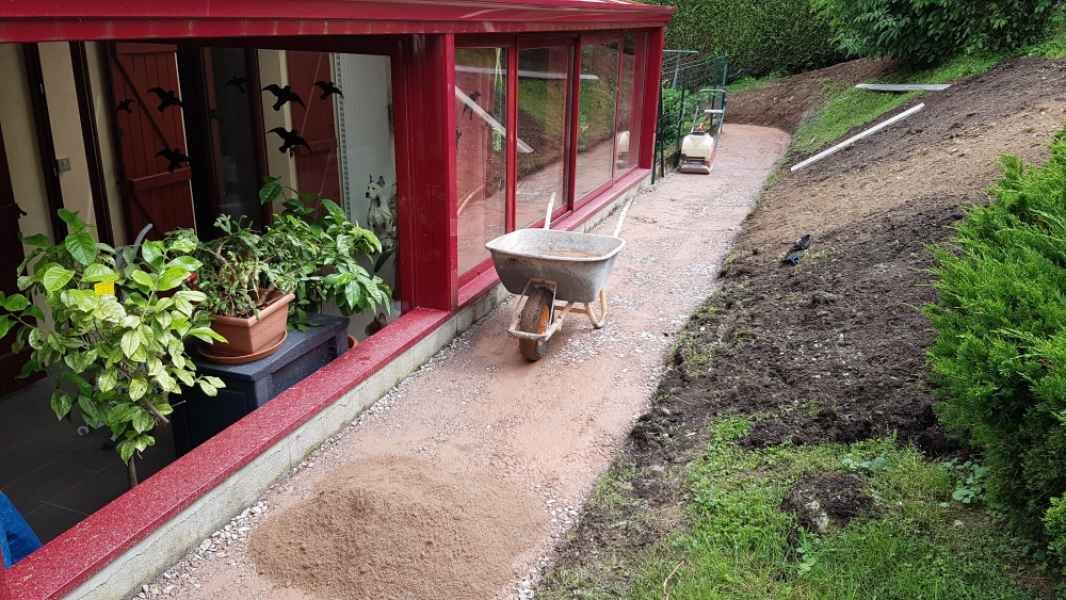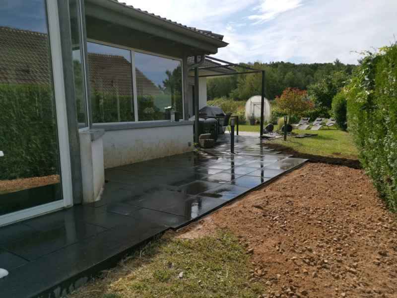 Préparation du sol, création d'un drainage le long de la terrasse, créations de bordures sur mesure en béton armé, pose d'un geotextile et de granulats décoratifs.