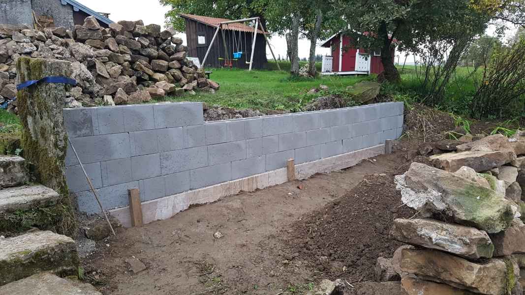 Reprise d'un mur de soutènement en pierres sèches effondré. Création d'une fondation armée. Mur en blocs à bancher armés. Habillage en pierres sèches pour rester dans le style.