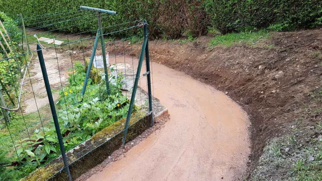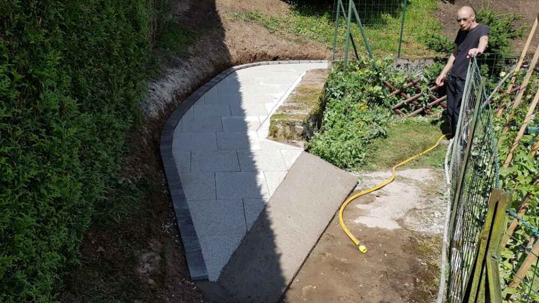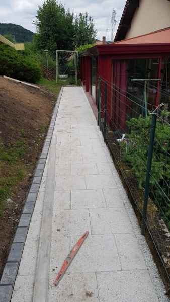 Création d'une allée. Terrassement, pose de dallage sur géotextile et lit de sable. Bordures en pavés maçonnés.