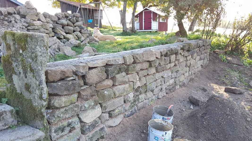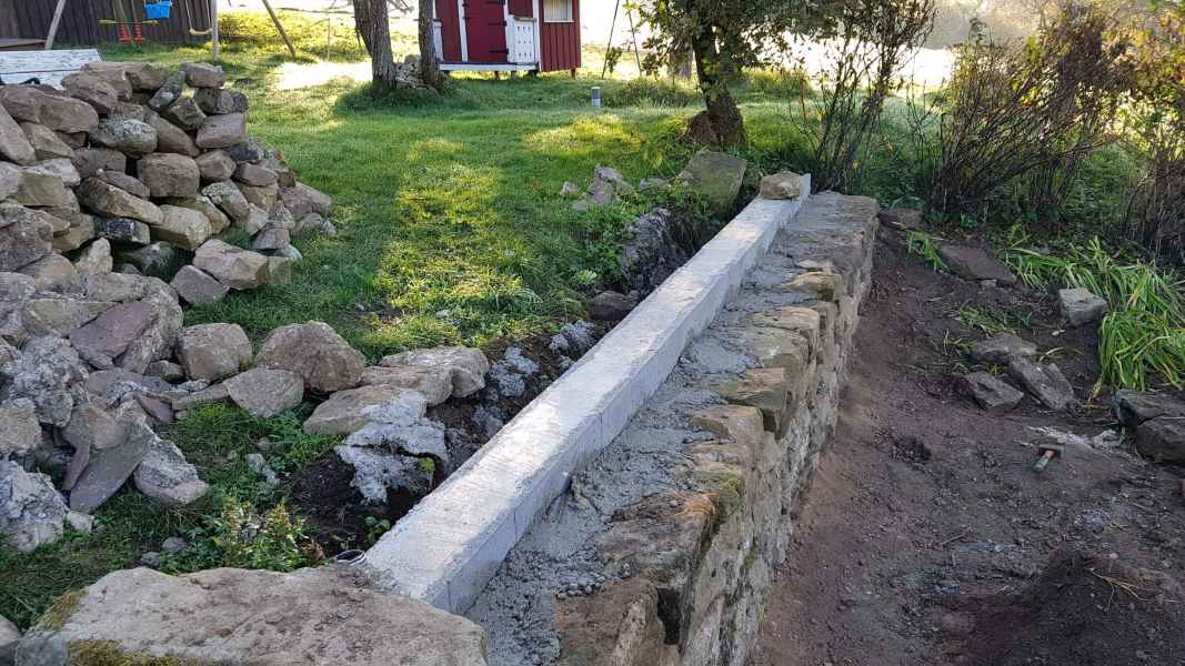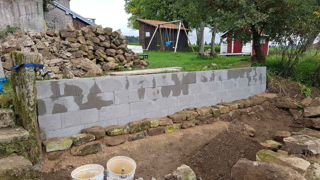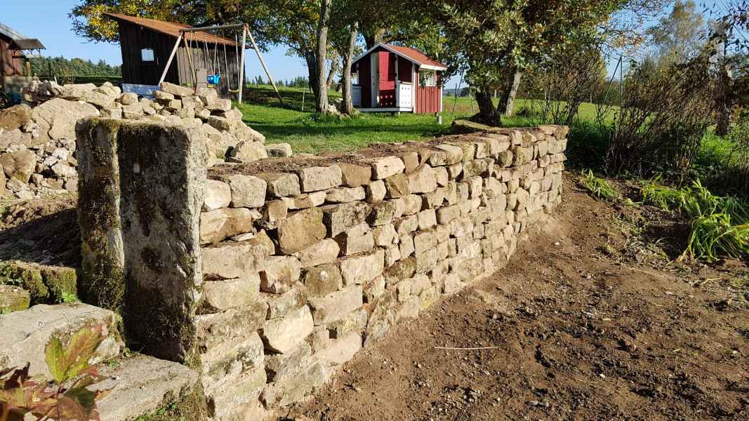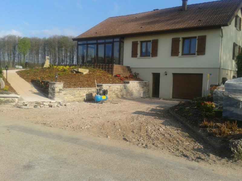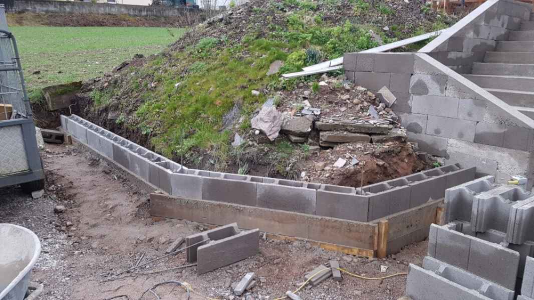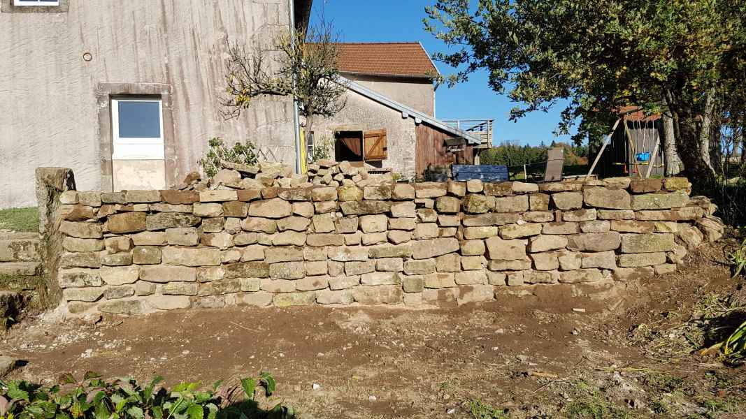 Reprise d'un mur de soutènement en pierres sèches effondré. Création d'une fondation armée. Mur en blocs à bancher armés. Habillage en pierres sèches pour rester dans le style.