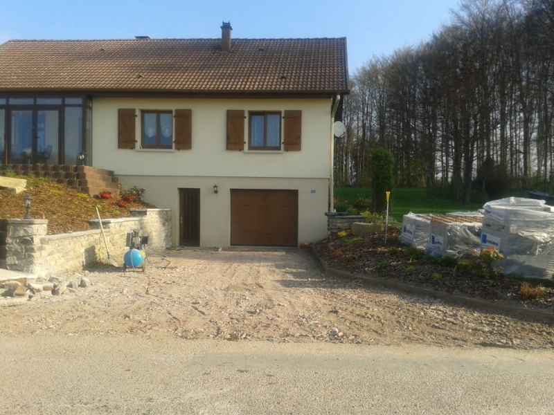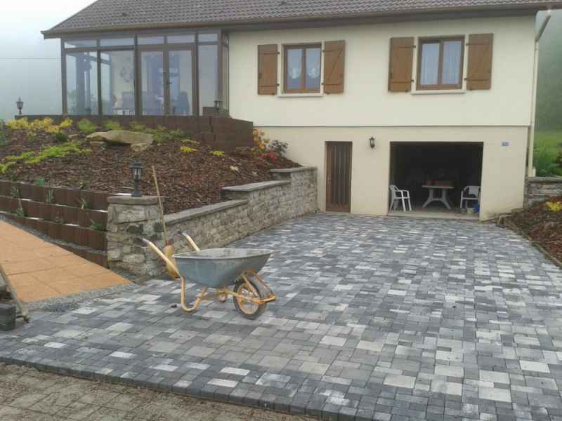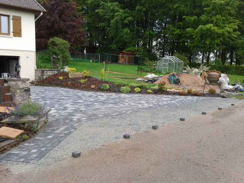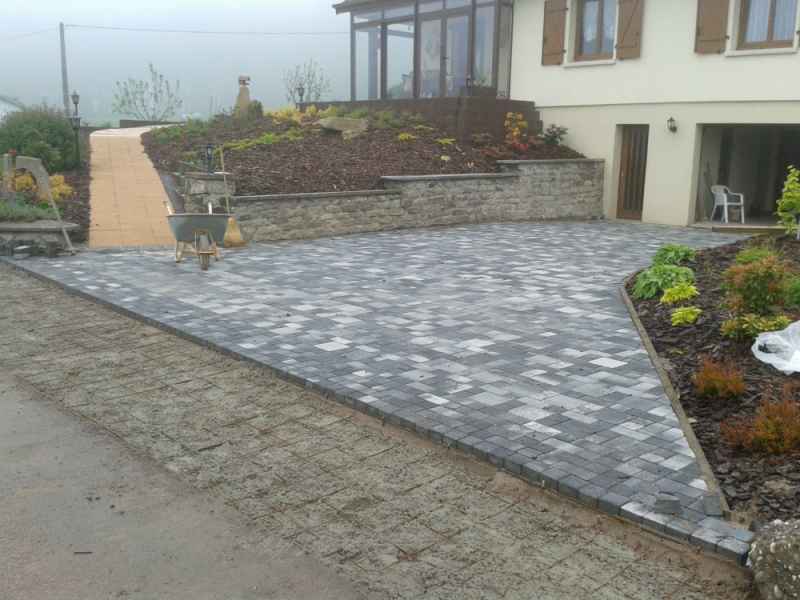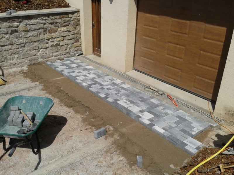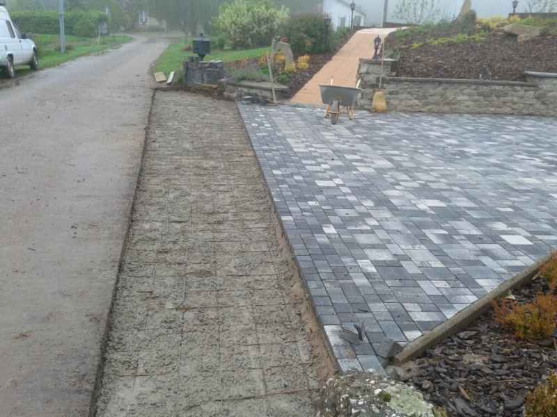 Création d'une entrée de garage en pavés sur chape maigre. Finition bord de route en béton gravillonné.