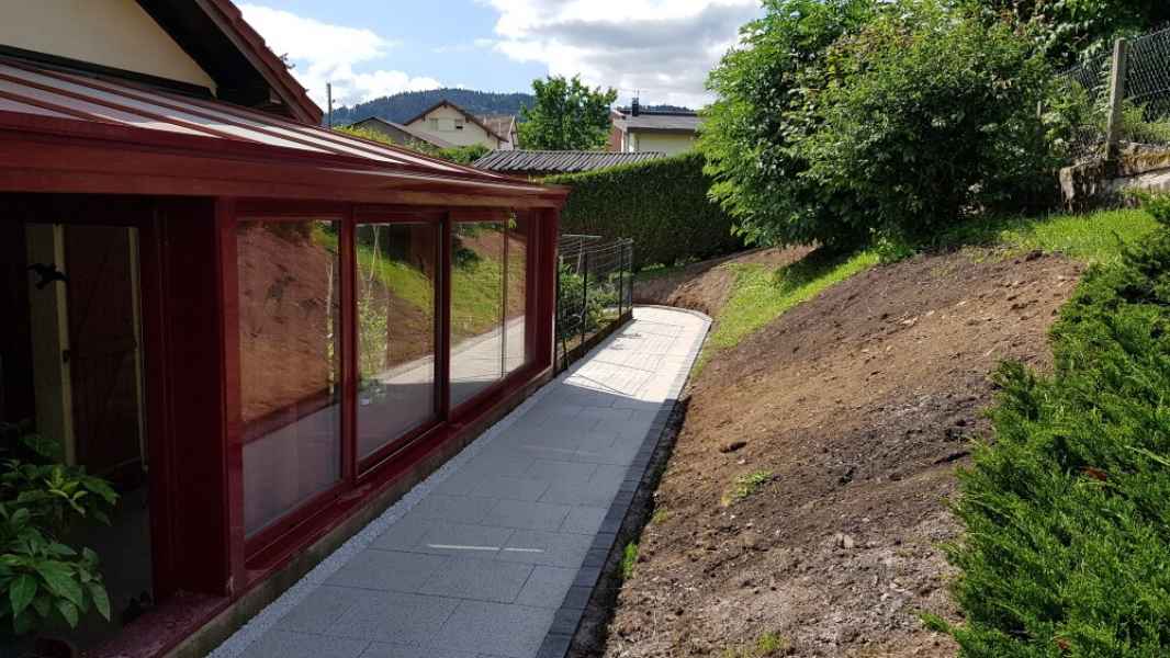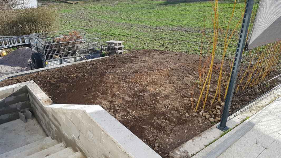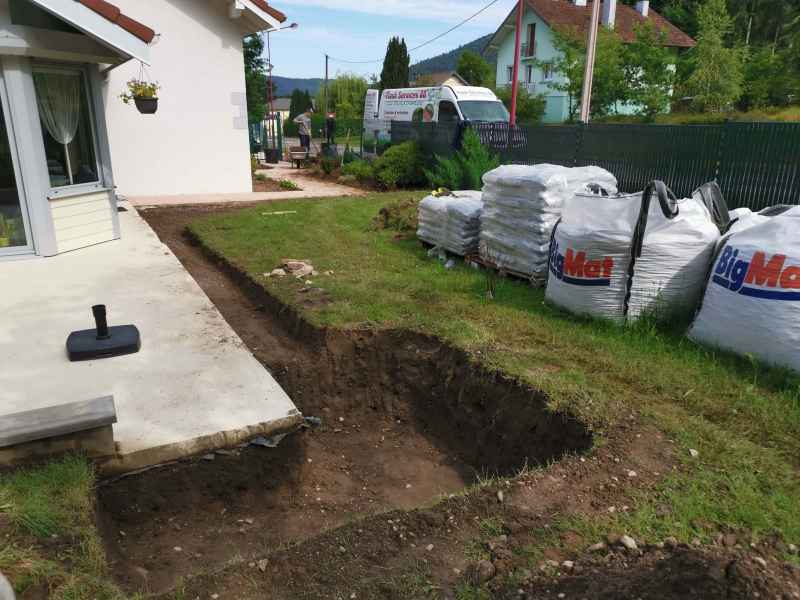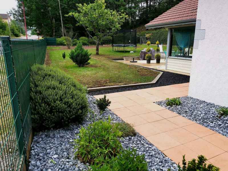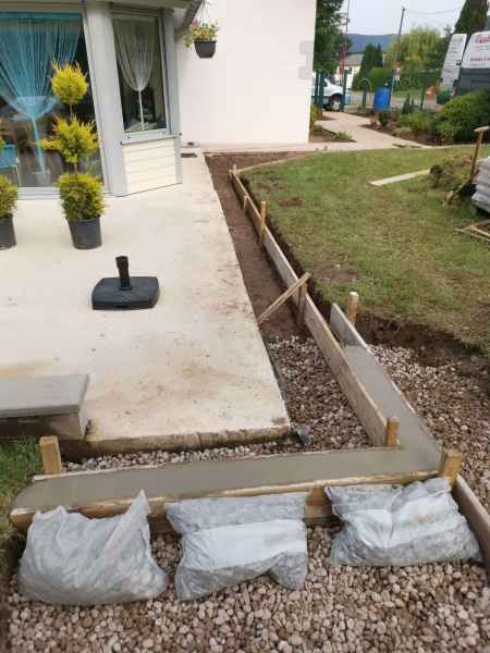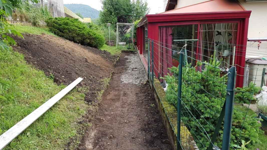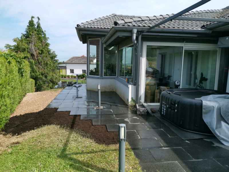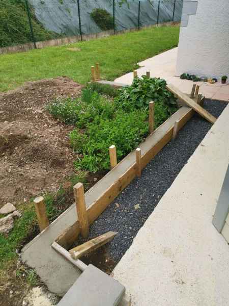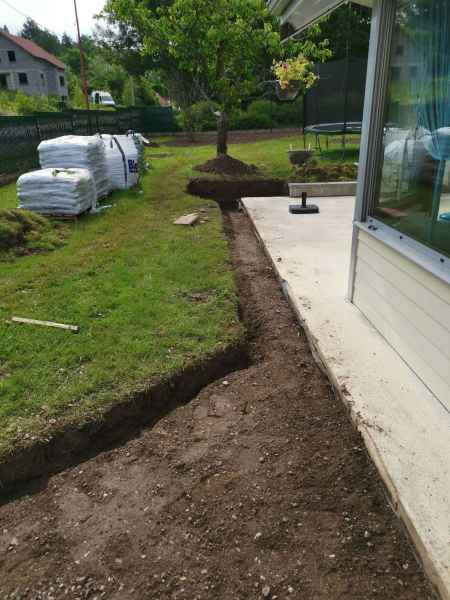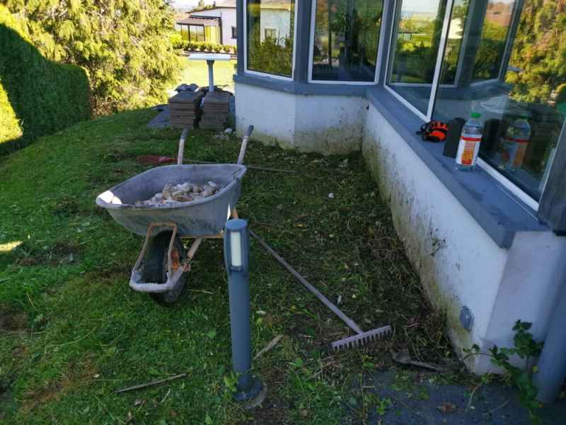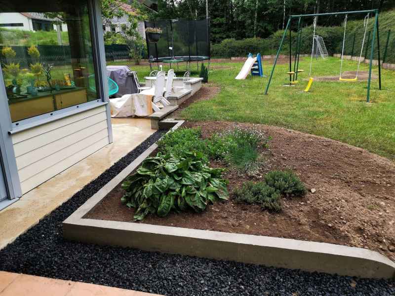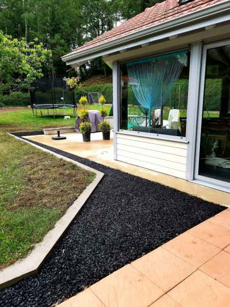 Préparation du sol, création d'un drainage le long de la terrasse, créations de bordures sur mesure en béton armé, pose d'un geotextile et de granulats décoratifs.