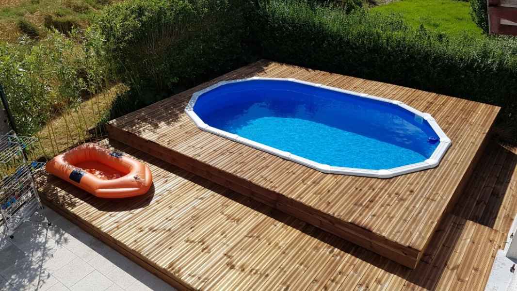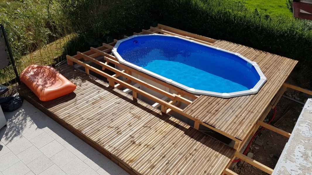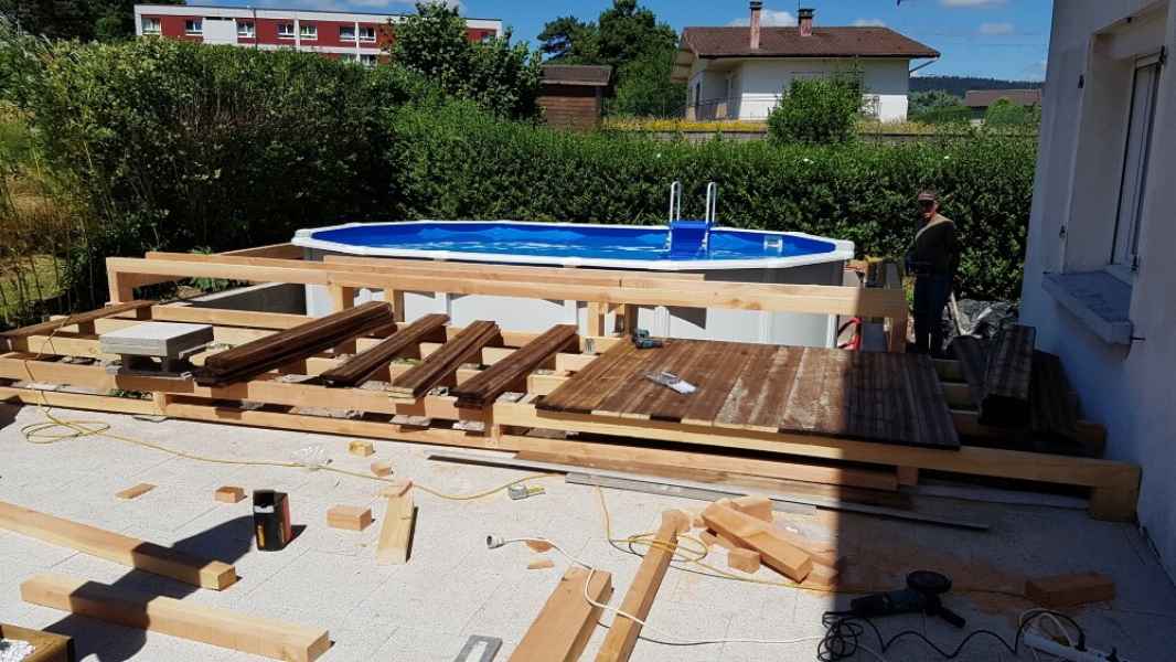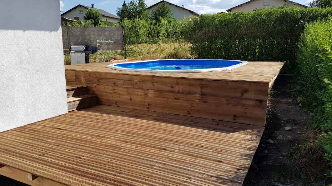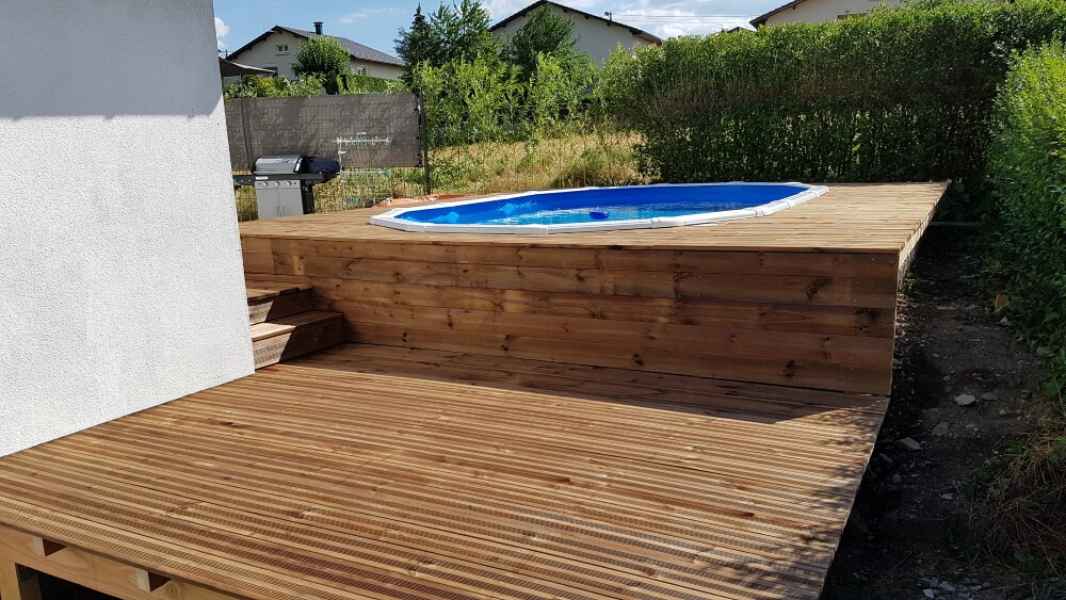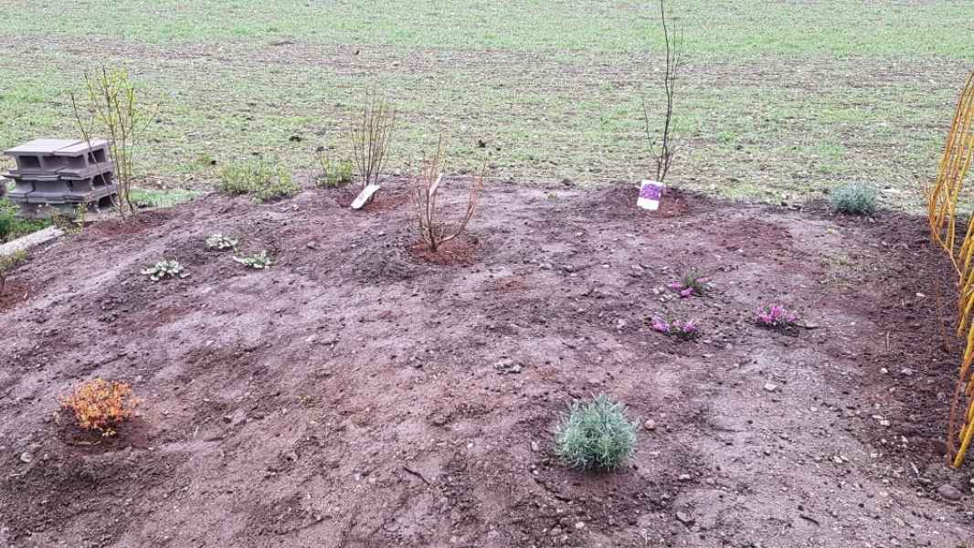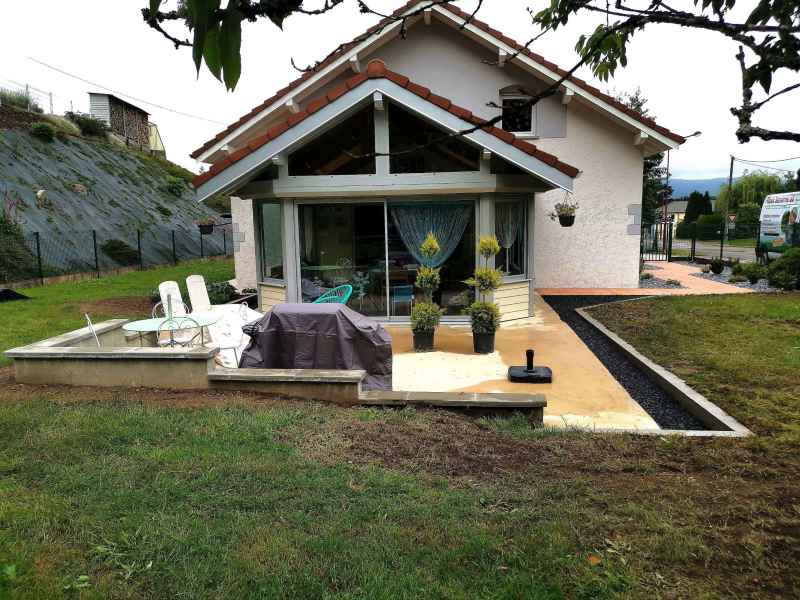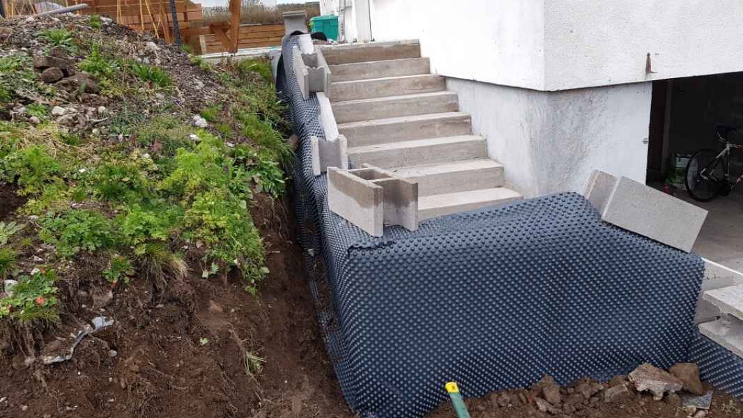 Préparation du sol, création d'un drainage le long de la terrasse, créations de bordures sur mesure en béton armé, pose d'un geotextile et de granulats décoratifs.