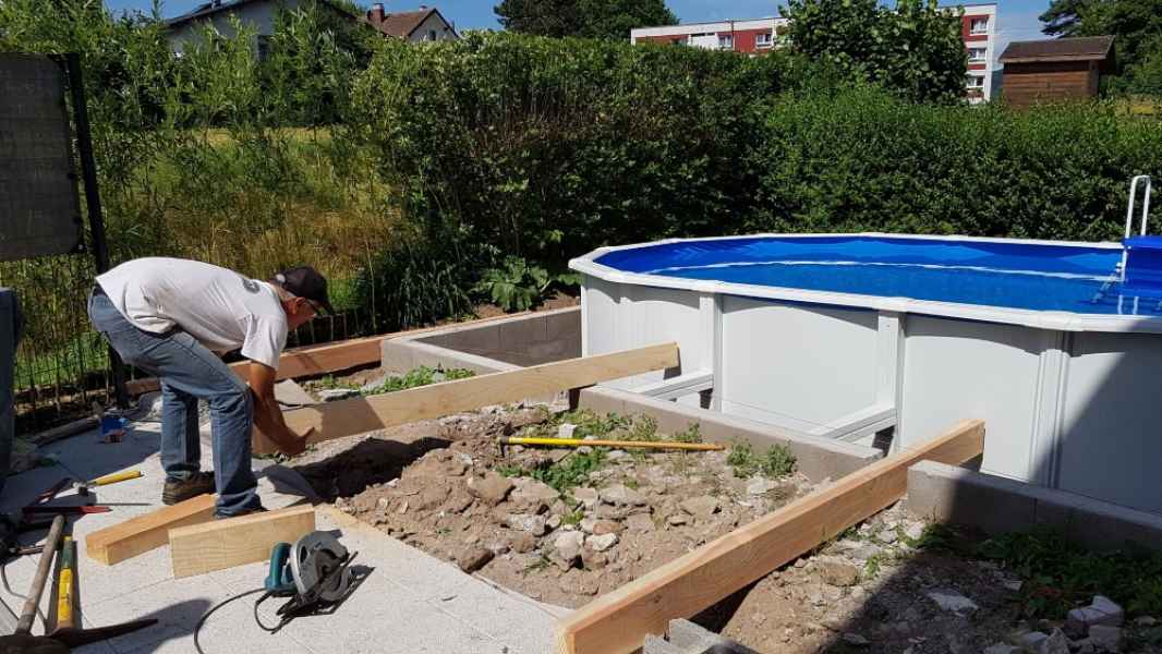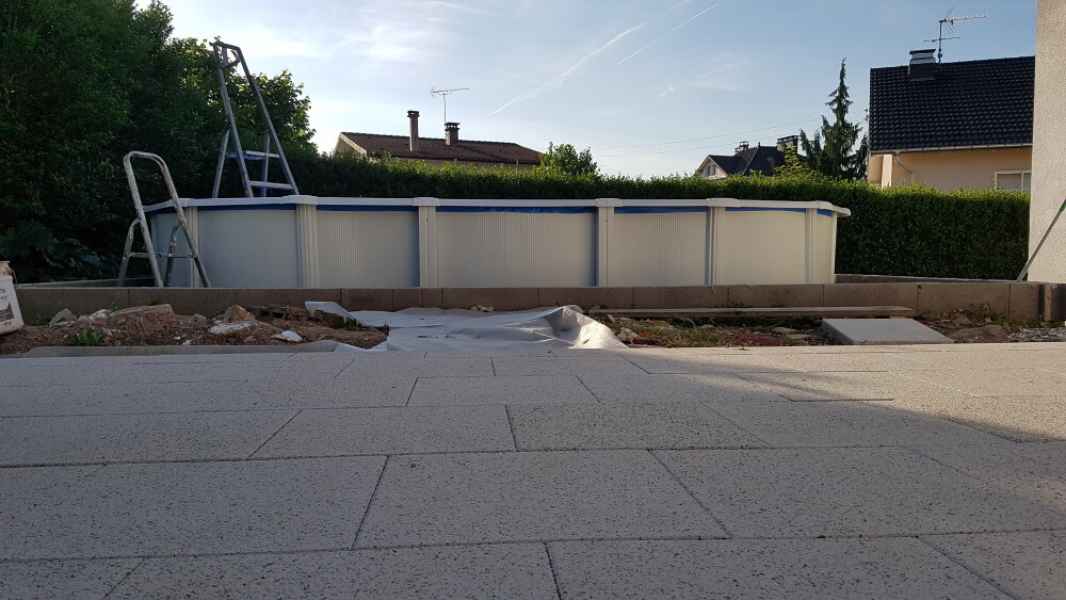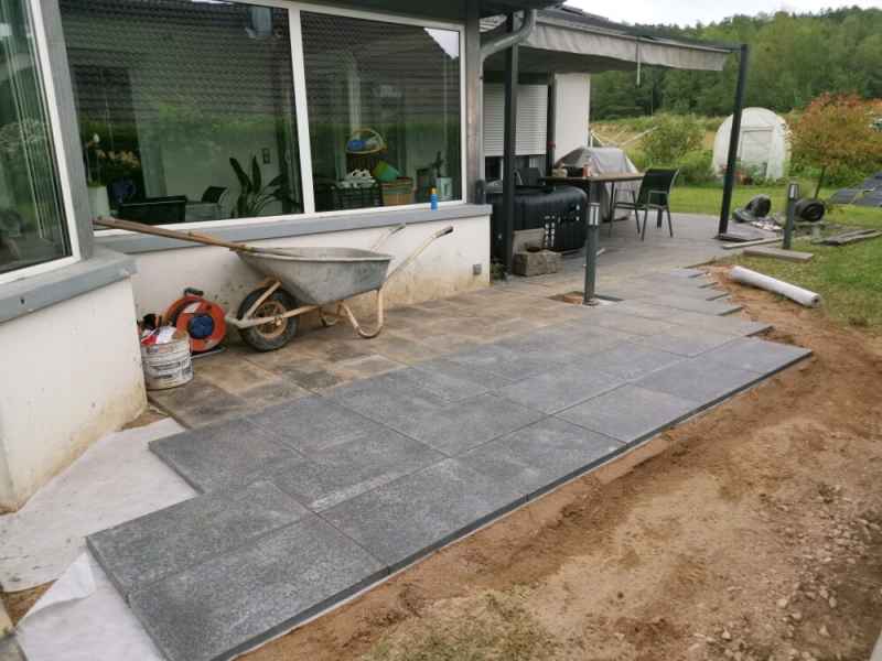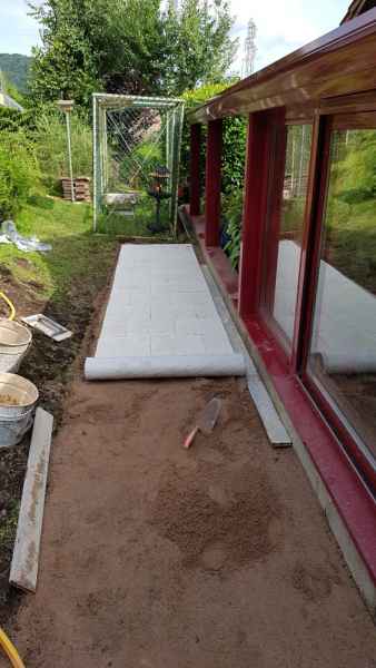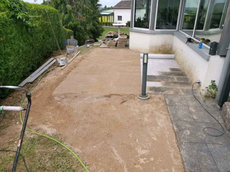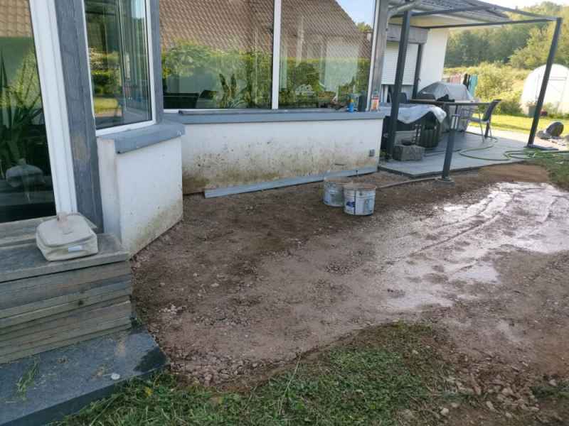 Extension de terrasse. Préparation du sol, pose de dallage sur lit de sable compacté.