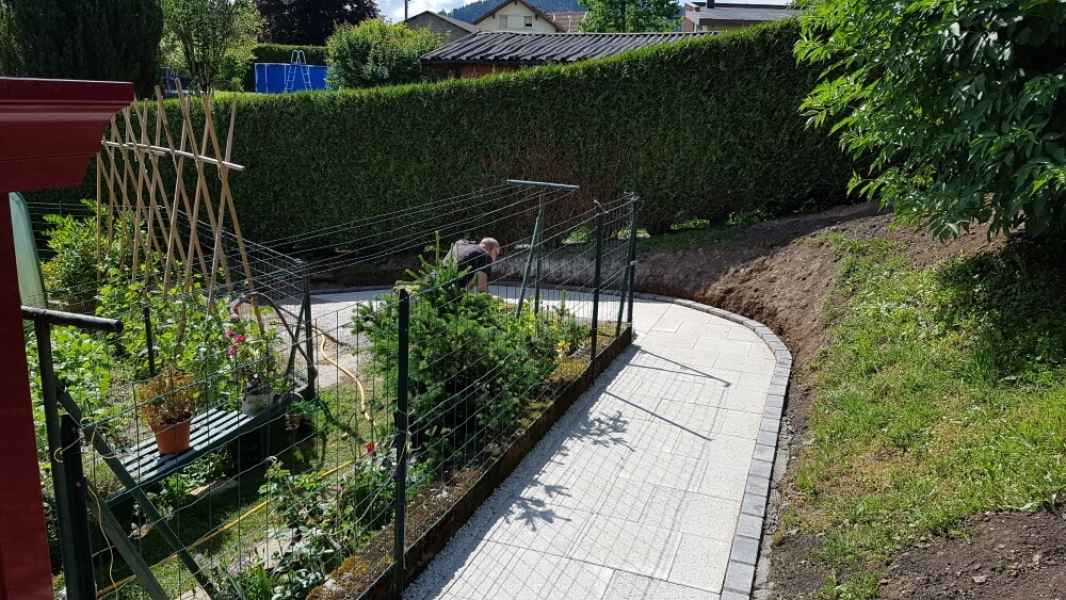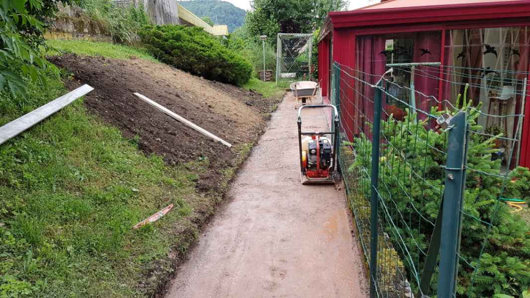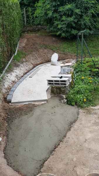 Création d'une allée. Terrassement, pose de dallage sur géotextile et lit de sable. Bordures en pavés maçonnés.